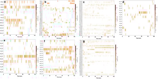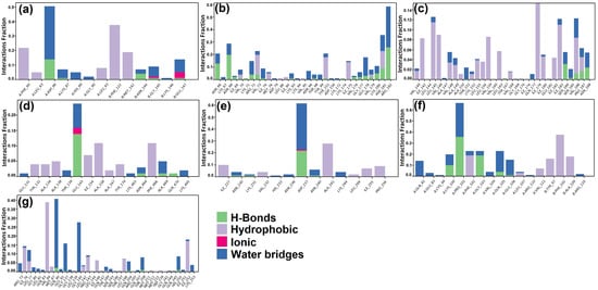 Timeline representation of interaction and contacts between target proteins and their respective ligands: (a) CiaR–campesterol; (b) LepC–meliantrol; (c) OppC–stigmasterol; (d) SecA–citrostadienol; (e) SMU1784c–citrostadienol; (f) SpaR–isofucosterol; (g) Yidc2–ursolic acid.