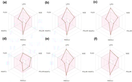 Bioavailability RADAR Plot analysis of the selected top hit ligands: (a) campesterol; (b) citrostadienol; (c) isofucosterol; (d) meliantrol; (e) stigmasterol; (f) ursolic acid.
