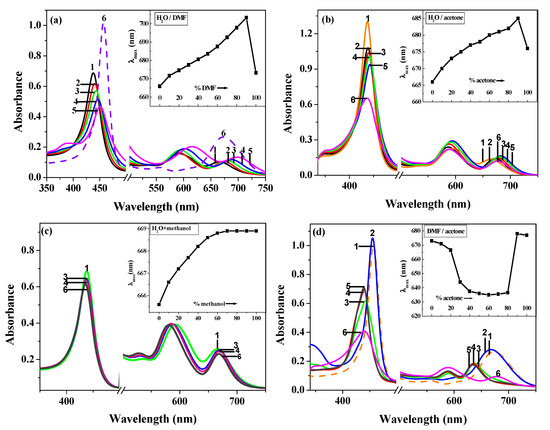 - Guo, H.; Jiang, J.; Shi, Y.; Wang, Y.; Dong, S. Solvent effects on spectrophotometric titrations and vibrational spectroscopy of 5,10,15-triphenyl-20-(4-hydroxyphenyl)porphyrin in aqueous DMF. Spectrochim. Acta Part A 2007, 67, 166–171. [Google Scholar] [CrossRef] [PubMed]