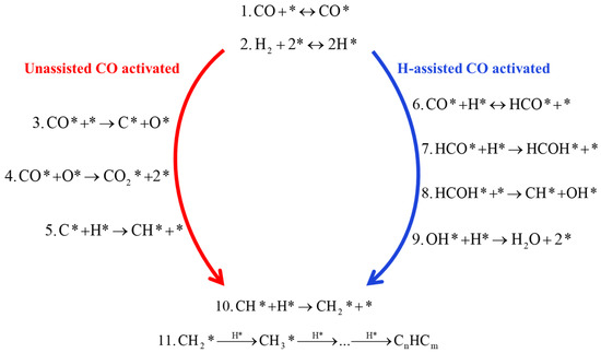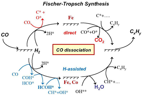 In general, the FTS can be described as a polymerization reaction, where three essential steps are identified: the first step is the initiation, which involves the adsorption of CO and H2 on the metal surface; the second step is the polymerization and chain formation; and the third step is products desorption [39]. As shown in Figure 2, direct dissociation pathways and H-assisted pathways have been proven to play an important role in kinetic-related CO dissociation steps on Fe- and Co-based catalysts. In the direct dissociation pathway, CO directly dissociate on the Fe surface to C* and O* species for subsequent reactions. In the H-assisted pathway, CO molecules are not directly dissociated on the surface of Fe- and Co-based catalysts, and CO forms COH* or HCO* intermediates with H* species. Intermediate species formed in these pathways can be continuous reactions, such as chemically adsorbing hydrogen (H*) on the surface of Fe- and Co-based surfaces to interact with CO* hydrogenated to form HxCO species, or directly forming OH* precursors, resulting in the preferential repulsion of H2O by O atoms in CO. On the Fe-based surface, CO* interacts with O* to form CO2. These assisted pathways represent the exclusive CO activation routes on Co surfaces and the predominant one on Fe catalysts at relevant FTS conditions. H-assisted pathways occur concurrently with unassisted CO dissociation on Fe-based catalysts with oxygen rejection as CO2 [45]. Both pathways produce intermediates with significant chain growth under the desired reaction conditions.