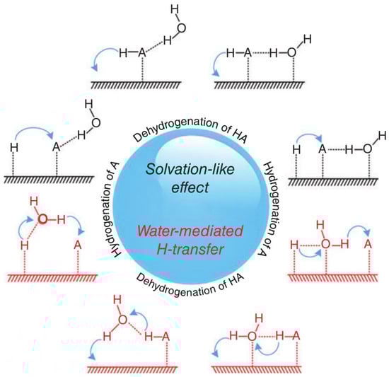 Schematic of the promotional role of water molecule: solvation-like effect (in black) and water-mediated H-transfer (in red). A refers to reactants of hydrogenation reactions, and H-A refers to reactants of dehydrogenation reactions. Reproduced with permission from ref. [21]. Copyright (2016) Wires.