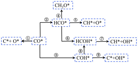 The presence of an OH group contributes to improve the C-O bond breaking ability compared to the co-adsorption with H* species, which leads to an increase in CHX [33,61]. Therefore, in addition to unassisted CO activation and H-assisted CO activation pathway, Gunasooriya et al. [33] reported an OH-assisted CO pathway. As shown in Figure 6, CO* intermediate can be directly dissociated into C* and O* [33] (i.e., the carbide mechanism, step 1, Figure 6). Meanwhile, both hydrogenated CO* and RCO* preferentially hydrogenate at the C* species due to the geometry of the OH groups, forming the intermediate HCO* species [33] (step 2, Figure 6). The intermediates of HCO* and formaldehyde (H2CO*) intermediates are the co-adsorbed CO* and H* formation routes demonstrated by Mitchell et al. (step 4, Figure 6) [72]. The reaction forming CH* and O* from the HCO* intermediate dissociate directly (step 5, Figure 6), and CH* species continue to hydrogenate to form CH2*. HCO* species are hydrogenated to hydroxylmethylene (HCOH*), a reaction mechanism recently proposed by Gunasooriya et al. [33,73]. HCOH* species form CH* and OH* by double-assisted dissociation (step 7, Figure 6). Another alternative pathway is through hydrogenation of the oxygen end of CO* to form hydroxyl-carbene (COH*) as an intermediate (step 3, Figure 6), further dissociating into OH* and C* species [74] (step 9, Figure 6). This pathway avoids the formation of H2CO. CO* may be hydrogenated by the C* or O* species to form HCO* or COH* species as reaction intermediates, respectively. With respect to the H-assisted routes, the formations of HCO* and COH* are an endothermic process, and the formation of COH* is kinetically more favorable than the formation of CHO* species and the direct dissociation CO. In both cases, the formation of intermediates (CHO* and COH*) has a subsequent dissociation step leading to the formation of CH* or OH* species. In the FTS process, the OH* group on the surface is the effective hydrogenated substance.