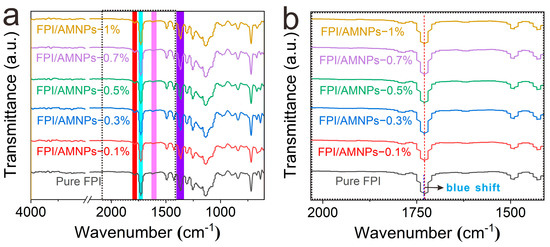 FTIR spectra of FPI/AMNPs films. (b) is an enlarged view of the dotted box area of (a).
