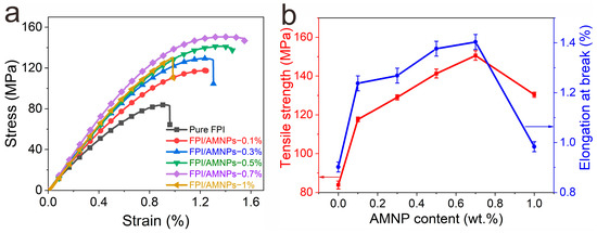 (a) Stress–strain curves of FPI/AMNPs films; (b) influences of AMNPs content on FPI/AMNPs films’ elongation and tensile strength at rupture.