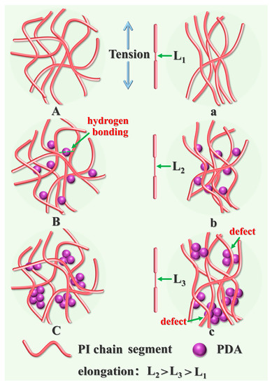 The conceptual pictures of AMNPs dispersed in FPI matrix: (A) pure FPI, (B) well-dispersed FPI/AMNPs networks at low AMNPs loading, (C) AMNPs aggregate in FPI matrix at high loading. (a–c) are pictures after tension, respectively.