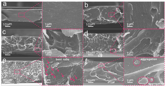 The fracture surface morphologies of the films were used to verify their mechanical properties (Figure 6). The fracture surface of pure FPI was flat and smooth (Figure 6a). With the addition of AMNPs, the cross-section morphology of the FPI was significantly changed. From the images of Figure 6b–e, some agglomerative grains and plastic deformed veins appeared, corresponding to the shrinkage deformation of the films. Moreover, the number of veins increased and the size decreased, and the fracture surface morphology gradually became irregular with the increasing content of AMNPs, which was attributed to the increased hydrogen bonding linkages between the FPI and AMNPs. Additionally, the entanglements within polymer chains greatly restricted the crack along the fracture surface. At this point, interface control became critical. Well-dispersed AMNPs can promote the efficient hydrogen bonding linkages with FPI to obtain a stable inorganic-organic network. At low AMNPs loading, it is difficult to find AMNPs on the fracture surface because of the pleats and the protuberances (Figure 6b–d), whereas at a higher loading (Figure 6e), homogenous veins appeared, and some AMNPs are visible on the fracture surface with uniform distribution. This can be ascribed to the induced crack because of the increases in free volume fraction at higher AMNPs contents. As the AMNPs content further increased, thick veins and pleats appeared along with obvious aggregation, as shown in Figure 6f. The high concentration of nanoparticles restricted the formation of percolated particle network and resulted in the changes in the fracture morphology. It is worth noting that the nanoparticles went through the process from volume strain to particle debonding and finally produced the shear yield. The films absorbed a lot of energy during this process and eventually reached their breaking point. However, defects generated by abundant AMNPs prevent stress dispersion, leading to fracture at the defects. In addition, a small amount of AMNPs can encourage fracture expansion and strengthen the mechanical properties of the composites.