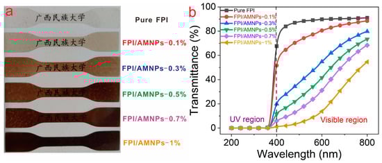 A digital image of pure FPI and its composite films is displayed in Figure 7a. As can be seen, pure FPI has extraordinary transparency, allowing full visibility of the covered fonts. However, with the accumulation of AMNPs content, the color of the composite films gradually deepened with declining transparency. The results were all confirmed in the UV-vis spectra (Figure 7b). Pure FPI film exhibited the best visible light transmittance of 91.1% at 800 nm, but the transmittance of composite films in the visible light range declined as the AMNPs content increased. However, FPI/AMNPs-0.7% still possessed a good transmittance of 68.4% at 800 nm. All of the FPI/AMNPs films displayed admirable UV absorption, indicating their potential for UV-shielding applications.