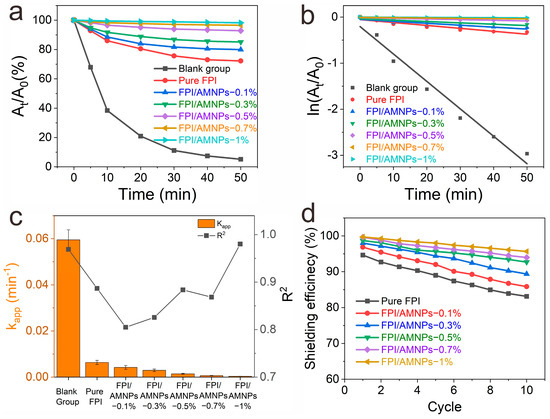 For the sake of quantifying the UV-shielding efficiency of FPI/AMNPs films, the decay and dynamic reaction rate curves of curcumin decomposition were constructed (Figure 9a,b). Figure 9a shows that curcumin decayed the fastest in the blank group. In contrast, the decay rate of curcumin shielded by pure FPI developed was dramatically reduced, indicating its shielding ability. Furthermore, the attenuation degree of curcumin decreased with the increase in AMNPs content, manifesting that AMNPs enhanced the UV-shielding effect of FPI.