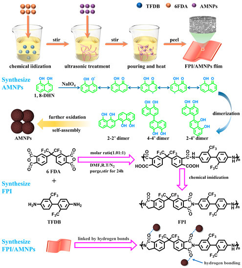 Schematic illustrations of the preparation of FPI/AMNPs films are displayed in Figure 10. Concretely, 3.8428 g TFDB was dissolved in 60 mL DMF. Then, 5.3827 g 6FDA was added at once with stirring again for 24 h at room temperature under N2 atmosphere. A mixture of 14.4 mL acetic anhydride and 7.2 mL pyridine was added bit by bit to the solution. After stirring for another 18 h, heat up to 60 °C for 6 h, 80 °C for 2 h and 100 °C for 2 h. The obtained solution was poured into excess anhydrous ethanol to obtain flocculent FPI precipitation with multiple filtration and ethanol washing before drying for 24 h at 120 °C.