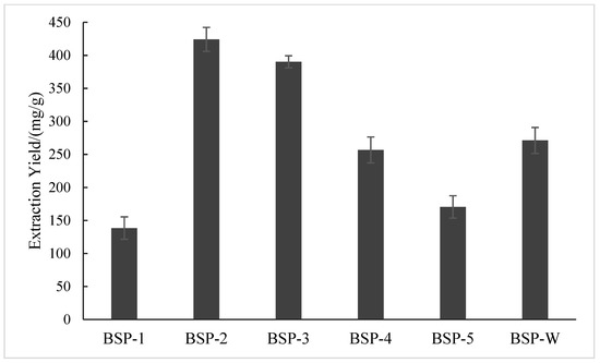 At present, the methods commonly used for BSP extraction are the hot water extraction method, the acid and alkaline extraction method, the ultrasound-assisted drawing method, and the microwave-assisted draining method [11,12]. However, the hot water extraction method consumes a large amount of energy and yields are not high, while acid and alkaline extraction can damage the structure of polysaccharides. Ultrasound and microwave-assisted extraction require the use of professional instruments and are not conducive to large-scale extraction [13]. Therefore, it is critical to find a method that is inexpensive, efficient, environmentally friendly, and practical.