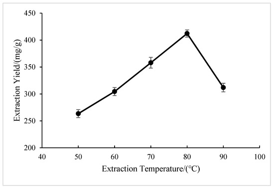 As shown in Figure 3, at 50 to 80 °C, the extraction yield of BSP increased as the extraction temperature rose. A probable reason could be that an increase in temperature is able to enhance mass transfer efficiency and facilitate BSP extraction [27]. BSP had a maximum extraction yield at 80 °C. Afterward, the glucose yield fell as the temperature rose. This might be the result of the polysaccharide degrading at an excessively high temperature, which lowers the polysaccharide production. Therefore, 80 °C was chosen as the ideal extraction temperature.