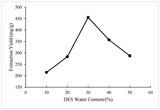 As shown in Figure 4, the extraction yield of BSP with the extension of the DES water content showed a trend of first rising and then declining, with the highest extraction yield at 30% DES water content. This could be due to the large viscosity of the DES solution system when the water content is low, which limits mass transfer. This means that polysaccharide cannot be fully precipitated, resulting in a decrease in the yield of polysaccharide [28,29]. The increase in water content can increase the dissolution rate of polysaccharides, while the viscosity of DES decreases with the higher water content. But according to the literature, the function of the hydrogen key between the hydrogen key receptor and the hydrogen key supplier is disrupted after the water-containing content exceeds 30% [30,31], so 30% was ultimately selected as the optimal water content.