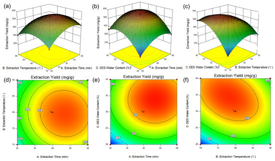 Response surface (a–f) shows the Extraction Time (A), Extraction Temperature (B) and DES water content (C) effect on the extraction yield of BSP.