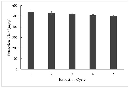BSP was extracted via the recovered DES for five cycles. As shown in Figure 7, the extraction yield of BSP declined slightly after each cycle. The extraction yields of BSP were (540.94 ± 9.15) mg/g and (501.66 ± 6.77) mg/g from the first to the fifth cycle, only decreasing by 7.26%. The decrease in extraction yield can be attributed to the introduction of impurities in the recycling process [35]. The recycling studies demonstrated that the DES could be recycled and reused well.