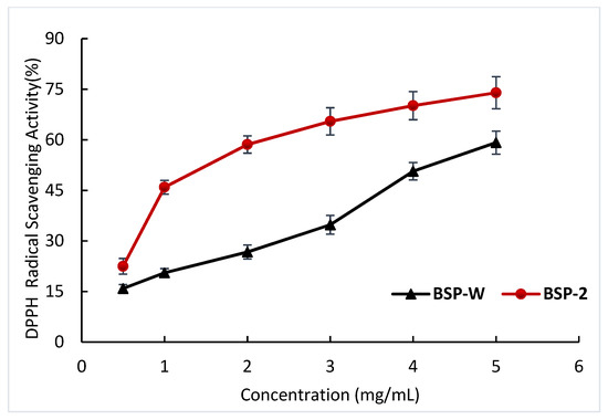 Due to the fact that DPPH radical can form stable molecules by pairing with electrons or hydrogen radicals, the DPPH free radical scavenging assay is frequently used for evaluating the activity of natural antioxidants [36]. The DPPH radical scavenging activities of the different BSP are shown in Figure 8. The DPPH radical scavenging activities of BSP-2 increased with increased concentrations and showed a concentration–dose effect. At a sample concentration of 5 mg/mL, the scavenging activities were the largest, 73.97%, with the scavenging activities increasing by 24.99% compared to BSP-W (59.18%). The data showed that the DPPH radical scavenging activities of BSP-2 extracted with DES-2 were stronger. The reason for this is that different extraction methods that cause differences in the polysaccharide molecular weight may affect bioactivities [37,38].