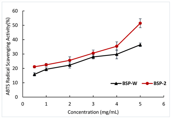 The ABTS cation radical is formed through ABTS, peroxide and hydroperoxide. The assay for scavenging ABTS radicals is based on the decrease in absorbance at 734 nm as the ABTS radical is scavenged by antioxidant chemicals [39]. As shown in Figure 9, the scavenging activity of ABTS radical increased with increasing sample concentration, indicating that the two showed a clear dose–response relationship. At a sample concentration of 5 mg/mL, the scavenging activity was the largest, namely 51.44%. Compared to BSP-W (36.44%), scavenging activities increased by 41.16%. This indicates that the antioxidant activity of the BSP extracted from DES-2 (choline chloride–urea) was stronger than the BSP obtained using conventional hot water extraction. In addition to different molecular weights caused by different extraction methods, the cause of this result may also be that some DES components are able to improve the antioxidant activity of extracts, suggesting that there may be a synergy between DES and soluble compounds [40,41].