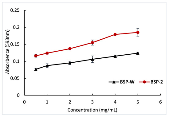 The ferric reducing antioxidant power assay, which uses the antioxidant polysaccharide’s ability to donate electrons to reduce Fe3+ to Fe2+, is frequently used to assess a polysaccharide’s antioxidant capacity [42]. From Figure 10, it was shown that the ferric reducing antioxidant power was arranged from high to low: BSP-2 > BSP-W. At a sample concentration of 5 mg/mL, the ferric-reducing antioxidant power of BSP-2 was increased by 49.19% compared to BSP-W. The results showed that the BSP extracted from DES-2 was superior to the BSP extracted from hot water in terms of reducing power. Additionally, the reducing power increased as BSP-2 concentrations rose, indicating a positive correlation between the two. The different extraction methods of polysaccharides might lead to some differences in the polysaccharide structure [43]. The changes in polysaccharide structure caused by DES are probably able to improve the antioxidant activity of polysaccharides [44]. In conclusion, BSP-2 had strong antioxidant activity and was better than BSP-W.