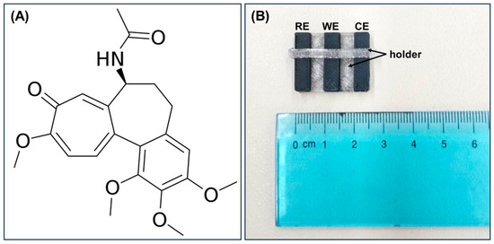 In this work, we exploited the advantages of FDM in the fabrication of a miniaturized and fully integrated 3D-printed device, which was applied for the first time to the voltammetric determination of Colc. The 3D-printed device was printed in a single step using a dual extruder 3D printer, and it was composed of three electrodes (printed by a carbon black–polylactic acid (CB/PLA)) filament and a holder (printed by a PLA filament) (Figure 1B). The 3D-printed device can be considered a ready-to-use sensor as it integrates the working, counter, and reference electrodes (WE, CE, and RE, respectively) and does not require any modification step with materials for the voltammetric determination of Colc. The developed voltammetric method was successfully applied to the analysis of pharmaceutical tablets and human urine.