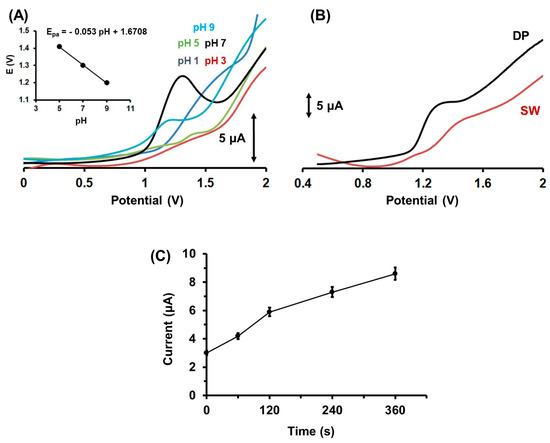 Figure 3. (A) Differential pulse voltammograms of 1 µmol L−1 Colc at an electrochemically activated 3D-printed CB/PLA electrode in solutions with different pH (HCl with pH 1.0 and 3.0, 0.1 mol L−1 PB with pH 5.0, 7.0 and 9.0). Inset: The linear relationship between the anodic peak potential of Colc oxidation and the pH. Accumulation for 120 s at −1.2 V. (Β) The effect of the scanning waveform (DP and SW) on the voltammetric response of 1 µmol L−1 Colc at electrochemically activated 3D-printed CB/PLA electrode. Accumulation for 120 s at −1.2 V. (C) The effect of accumulation time on the DPV response of 1 µmol L−1 Colc at electrochemically activated 3D-printed CB/PLA electrode. Error bars are the mean value ± sd (n = 3). Accumulation potential at −1.2 V.