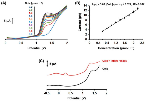 The effect of various possible interfering species, which can be included in pharmaceutical and biological samples, was examined by the addition of the substances to a solution containing 1 µmol L−1 Colc (Figure 4C). Glucose, sucrose, urea, uric acid, lactic acid, and K+, Na+, Ca2+, NH4 +, Cl, PO43−, and SO42− did not interfere at a concentration ratio of 1:100 (Colc solution: interference compound), revealing adequate selectivity of the presented electrochemical method for the determination of Colc in real samples.