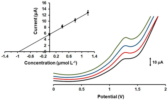 Figure 5. Differential pulse voltammograms obtained at the 3D-printed device for the determination of Colc in a human urine sample using the method of standard additions. Traces from below: urine sample spiked with Colc (black trace) and 3 standard additions of 0.4 µmol L−1 Colc (red, blue and green traces). Inset: the respective standard additions plot. The points in the plot are the mean value ± sd (n = 3). Accumulation potential −1.2 V for 120 s.