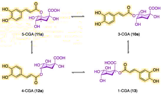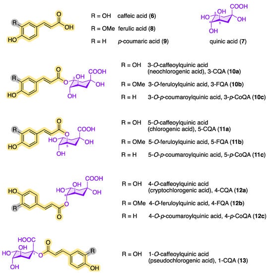 - Abrankó, L.; Clifford, M.N. An Unambiguous Nomenclature for the Acyl-quinic Acids Commonly known as Chlorogenic Acids. J. Agric. Food Chem. 2017, 65, 3602–3608. [Google Scholar] [CrossRef] [PubMed]