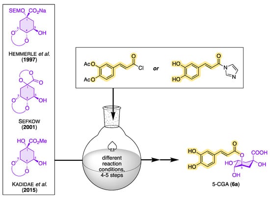 - Fischer, H.O.L.; Dangschat, G. Konstitution der Chlorogensäure (3. Mitteil. Über Chinasäure Derivate). Ber. Dtsch. Chem. Ges. A 1932, 65, 1037–1040. [Google Scholar] [CrossRef]