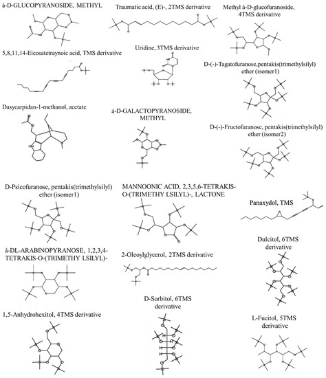 | Dulcitol, 6TMS derivative | 27.72 | 6.27 | 759 | 614 | C24H62O6Si6 | Anti-inflammatory Anticancer | [62] |