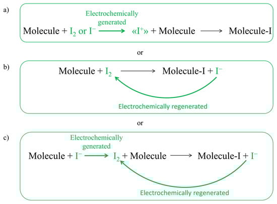 In particular, the research has focused on the development of electrosynthetic routes for common and widely used reactions, such as halogenation reactions. Halogen-containing compounds are useful both by themselves and as highly versatile intermediates in many fields, especially in pharmaceutical synthesis. Among the halogenations, this paper focuses on electrochemical iodination. Currently, the main use of iodination reaction is in the synthesis of intermediates, due to the ability of iodine to act as a leaving group. Some of the most common products of iodination are aromatic iodo compounds for cross-coupling reactions [4,5,6]. In the pharmaceutical industry, iodinated compounds are also widely used as contrast media (iopamidol, iohexol, iodixanol, …) and a rise of interest has been shown for the synthesis of iodinated active pharmaceutical ingredients (APIs). Some common iodinated APIs are povidone-iodine, an antiseptic used for skin disinfection, amiodarone, an antiarrhythmic medication, and triiodothyronine, a thyroid hormone used to treat hypothyroidism. Iodination reactions are currently carried out using toxic and difficult-to-handle reactants, which add steps and costs to the final product, such as ICl [7], N-iodosuccinimide [8], and 1,3-diiodo-5,5-dimethylhydantoin [9,10]. Molecular iodine, which is intrinsically greener, is sometimes used as an iodinating agent, but it has two main drawbacks: low electrophilicity and low atomic efficiency. When dealing with iodination with molecular iodine, in fact, half of iodine atoms are lost as iodides. For this reason, usually its use is coupled with the addition of an oxidizing agent (such as H2O2) [11]. Electrochemistry can help the reaction by avoiding the addition of such oxidizing agents, transforming the iodine source in the active species using electrons as the main reactants. Electrochemical halogenation has already achieved good results in many cases [12], but it would be particularly useful to find synthetic methods that are even greener, simpler, and therefore more capable of undergoing an industrial scale-up than those investigated so far. To date, in fact, there are still several problems to be solved. For example, the generation of the iodinating agent and the iodination itself are usually carried out separately and in organic solvents, especially acetonitrile, that shows the ability to stabilize the “I+” reactive species [12,13,14,15,16,17]. To make the electrochemical iodination as green and simple as possible, in this study, the use of iodides or iodine as a source of iodine atoms for the generation/regeneration of the iodinating species in situ in water was investigated (see Figure 1).