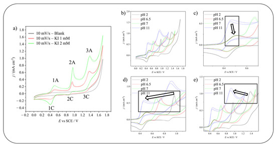 As shown in Figure 2a, on a GC electrode, KI gives rise to three anodic peaks. By studying the dependency on the pH of the position of these peaks, it is possible to identify the reactions and the species involved. Figure 2b shows the CVs of KI at different pHs and Figure 2c–e focuses on the shift of each peak: first 1A, second 2A, and third 3A, respectively.