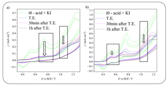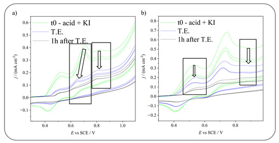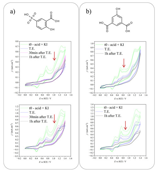 Focus on the current drop obtained during electrolysis producing (a) HIO or (b) I2 for 5-sulfosalicylic acid iodination. In both images, the left arrow indicates the decrease in the peak of the iodinating agent, while the right arrow highlights the diminution of the reagent peak. t0 = time 0, before starting the electrolysis, T.E. = theoretical end, calculated considering the quantity of charge needed to convert all the KI in the desired iodinating agent. Scan rate: 20 mV s−1.