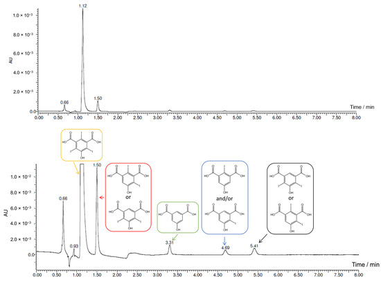 More concentrated electrosynthesis was also performed for 5-sulfosalicylic acid iodination. Experimental conditions were the same as for the 5-hydroxyisophthalic acid iodination mentioned above. Once again, the theoretical end was calculated on the basis of the quantity of charge needed to convert all the KI present in the solution in the iodinating agent (1.2 × 10−2 Faradays needed, 1.0 × 10−2 Faradays applied). UPLC-PDA-HR-MS analysis of the final mixture was then carried out, revealing two main products, as shown in Figure 8. MS analyses are reported in the Supplementary Materials S5.