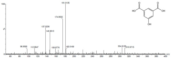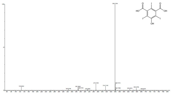 In order to be able to analyze the reaction products, more concentrated electrosynthesis was carried out for 5-hydroxyisophthalic acid. Considering that the possible products are the mono-, di-, and tri-iodinated substrates, electrosynthesis was performed in the presence of a KI excess (4:1). The potential corresponding to the HIO generation was applied (+0.7 V vs. SCE) and the reaction was stopped at almost the theoretical end. The theoretical end was calculated on the basis of the quantity of charge needed to convert all the KI present in the solution in the iodinating agent (1.20 × 10−2 Faradays needed, 1.05 × 10−2 Faradays applied). UPLC-PDA-HR-MS analysis of the final mixture was then carried out.
