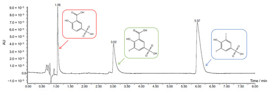 UV chromatograms (λ = 254 nm, isocratic separation: 10% of eluent B at 0.350 mL/min) of the UPLC-PDA-HR-MS analysis. Peaks identification: 5-sulfosalicylic acid (1.06 min), mono-iodinated product (3.02 min), and decarboxylated di-iodinated product (5.97 min).