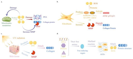 Mechanisms of skin aging processes. (a) Free radicals and oxidative stress theory. Mitochondria produce ROS through oxidative metabolism. Excessive ROS can damage the mitochondrial and DNA structures, leading to a decrease in collagen levels and an increase in MMP levels in skin tissue. (b) Inflammation theory. Senescent fibroblasts and keratinocytes secrete a large number of senescence-associated secretory phenotypes, including TNF-α, IL-1, IL-6, IFN-γ and MMPs. These proinflammatory cytokines induce skin cell senescence by promoting ROS production and activating the ATM/ p53/p21-signaling pathway. (c) Photoaging theory. Ultraviolet irradiation induces the production of ROS and the secretion of MMPs, which degrades skin extracellular matrix components such as collagen. (d) Nonenzymatic glycosyl chemistry theory. Non-enzymatic glycosylation is a reaction between free reducing sugars and free amino groups of proteins, DNA and lipids to produce AGEs and ROS. The accumulation of AGEs, together with ROS, can lead to changes in the cell homeostasis and protein structure. These images were drawn with the Figdraw software1.0.