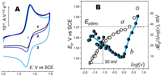 (A) Scan–rate–normalized voltammograms of 1h at a Pt electrode in CH3CN/0.1 M Bu4NPF6. Scan rates v: (1) 0.1, (2) 0.2 and (3) 1 V s−1. The cross denotes E0. (B) Variation of Ep of 1h with changes in scan rate. (a) Experimental (circles) and expected Ep(lim) (E0 + 28.5 mV [27]). (b) Derivative of Ep − log(v) plot (ΔEp/Δlog(v) vs. log(v)).