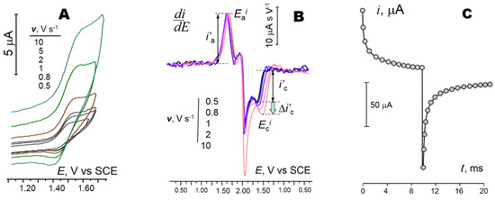 The IR-corrected ΔEp/Δlog(v) plots (Figure 4) all show a slope close to 30 mV per decade of the v (Table 1) characteristic of monomolecular follow-up reactions of CRs [27], corroborating the notion that the deprotonation of CRs is the potential-determining step. As a relatively slow ET competes with the deprotonation at v > 1–5 V s−1, assessing the kinetic contribution in the EC scheme through the characteristic test Ep − log(v) can only be used within the 0.02 < v < 1–2 V s−1 scan rate range. DCV also confirmed a mixed diffusion–ET control at the scan rates v = 1…10 V s−1, such that the total chemical reversibility of oxidation of 1 (with i′c/i′a = 1) could not be attained by increasing v (Figure 2B).