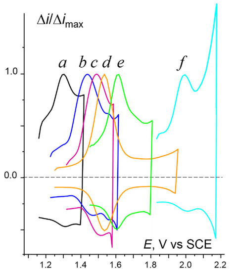 The half width of the oxidation peaks (ΔE = Ep − Ep/2) of 1, providing (through α and ks [27]) the information on ET kinetics, was also systematically higher (≈70–100 mV, except for 1e, Table 1) than the 58 mV of a purely Nernstian process [27]. This difference, remaining even after IR correction, was considered to arise from important structural changes induced by ET (the onset of the ET control at v = 2–3 V s−1 can be seen more clearly now, Figure 4), such that their oxidation can be qualified as being quasi-reversible.