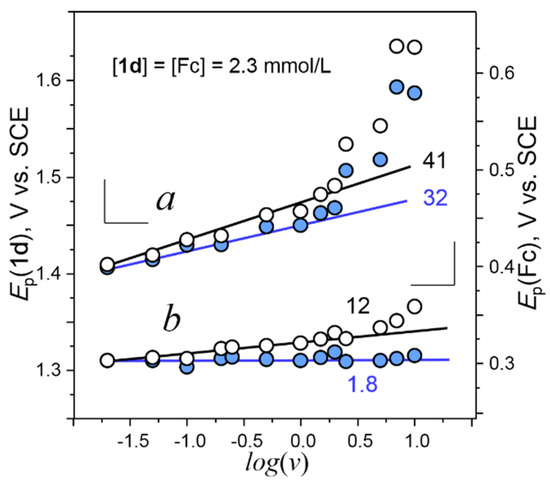 Ep − log(v) plots for the oxidation of 1d (a) and Fc (b) at a Pt electrode in CH3CN/0.1 M Bu4NPF6. Hollow circles: experimental points (Ep/log(v), mV/dec, black numbers); blue filled circles (blue numbers): IR-corrected to Ep(Fc)/log(v) ≅ 0 mV and ΔEpa-c(Fc) = 60 mV.