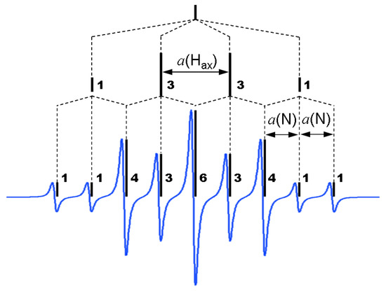 Schematic representation of the signal splitting at the N and H nuclei in the EPR spectra of “proper” silatranes. Smaller hfc constants from equatorial α-Heq and β-H protons are not shown. The numbers correspond to the resonance line integration intensities.