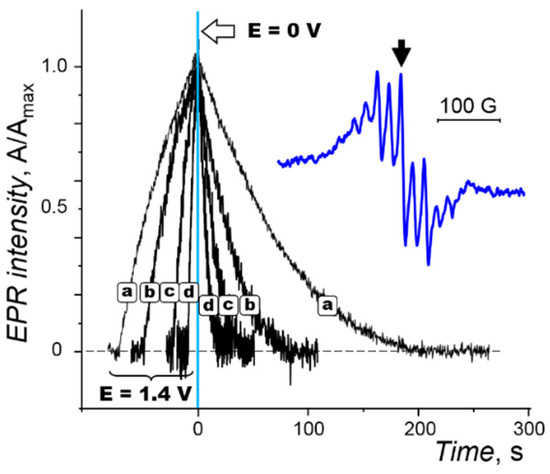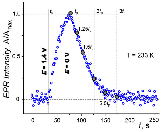Generation and time decay of the normalized EPR signal of 1b+• and its sampling for A/Amax − kjtp3/2/FD1/2 analysis [60]. Pt micro spiral electrode, CH3CN/0.025 M Bu4NPF6, static field 3374 G, f = 9.46 GHz, modulation 1 G, Microwave power 6.2 mW, T = 233 K.