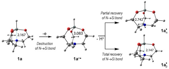 What might be the reason for these particularities of the deprotonation of 1+•? In order to answer this question, the variation in the length of the coordination contact N→Si (lSi-N) during the process 1a → 1a+• → 1a•α (1a•β) in CH3CN should be considered (Figure 11).