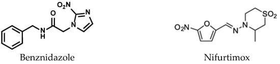 CD has two clinical phases: acute and chronic. The acute phase is relatively rare, with no specific symptoms detected, but it can be fatal in children. During the chronic phase that succeeds the acute phase, up to 30% of patients suffer from cardiac disorders and up to 10% experience digestive, neurological, or mixed disorders. To date, there is no perspective on an efficacious vaccine against trypanosomiasis, and the alternative is the development of safe and efficient chemotherapies to treat this disease. CD can be treated with two antiparasitic medicines: benznidazole and nifurtimox (Figure 1). Both medicines are nearly 100% effective in curing the disease if given soon after infection, including cases of congenital transmission. However, the efficacy of both diminishes the longer a person has been infected and the adverse reactions are more frequent at older age [4].