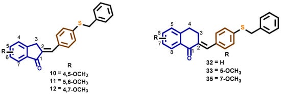3.2. General Procedure for the Synthesis of (E)-2-[4-(Benzylthio)benzylidene or (E)-2-[4-(Benzyloxy)benzylidene]-Benzocycloalkanone Derivatives 7–39
