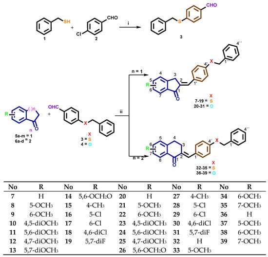 Benzylsulfanyl and 4-benzyloxybenzocycloalcanone derivatives 7–39. i: Ethanol, KOH, Δ, 24 h; ii: Ethanol, NaOH, rt, 24 h.