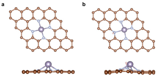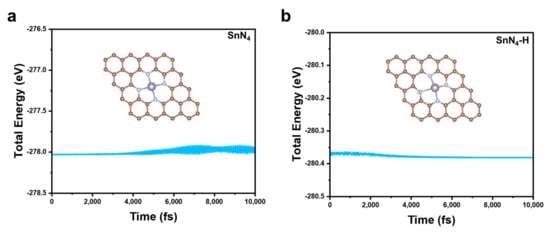 Based on previous research, nitrogen doping in graphene can be categorized into three types: pyridinic N, graphitic N, and pyrrolic N [5]. Experimental evidence suggested that pyridinic N exhibited high reactivity towards oxidation and reduction reactions, and the N-doped carbon framework was relatively stable under reaction conditions [18]. Therefore, this work focused on pyridinic nitrogen-doped graphene as the support for the Sn-SACs, and the coordination of N atoms was set as 4 according to the experimental characterization [19]. Figure 1a depicts the top and side view of a graphene substrate hosting a pyridinic Sn-N-C catalyst, with a single Sn atom occupying the center of a carbon vacancy, N atoms replacing four adjacent carbon atoms to form pyridinic N, then coordinating with a single Sn atom to form a Sn-N4 structure. Due to the large atomic radius of an Sn atom, a local bulge was created in the N-doped graphene matrix, and the average length of Sn-N bonds was 2.26 Å. In contrast, H-decorated catalyst SnN4-H was constructed by adsorbing an H atom onto pyridinic N (Figure 1b). The average length of the Sn-N bond was 2.29 Å, which indicated a slight extension of the Sn-N bond after H decoration. Due to their high surface energy, SACs can easily aggregate into clusters or nanoparticles. Therefore, the stability of the two Sn-SACs were analyzed via their binding energy to pristine and H-decorated N-doped graphene. The calculated Eb of SnN4 and SnN4-H was −5.85 eV and −4.81 eV, respectively. This result showed that both catalysts had Eb below 0 eV, indicating that the single Sn atom can be stably anchored on the N-doped graphene matrix. Moreover, the high surface energy of Sn atoms predisposes them to agglomerate into nanoclusters or particles. To address this issue, we conducted further investigations to assess the thermodynamic stability by comparing the binding energy with the bulk cohesive energy (Ecoh) of Sn, which was calculated to be −4.09 eV. Intriguingly, the binding energy (Eb) of both SnN4-H and SnN4 was found to be smaller than Ecoh, indicating effective prevention of Sn atom aggregation and stable anchoring on both pristine and H-decorated N-doped graphene surfaces. Additionally, we investigated the adsorption of single Sn atoms on the graphene matrix (Sn-gra), which exhibited a higher Eb (Table S1) compared to the Eb of SnN4 and SnN4-H, suggesting an unfavorable diffusion of Sn into the carbon matrix. To assess the dynamic stability of SnN4 and SnN4-H, ab initio molecular dynamics (AIMD) simulations were performed using the Nosé–Hoover thermostat model implemented in VASP. The simulations were conducted in the canonical ensemble at 300 K for a duration of 10 ps with a time step of 1 fs. As depicted in Figure 2, the system energy of both structures remained stable during the 10 ps simulation at 300 K. The stable structures after the simulation were shown in the inset. Although the energy of the SnN4 system exhibited minor fluctuations ranging from −278.02 eV to −277.91 eV, during the latter half of the 10 ps simulation, the overall system remained stable. Similarly, for the SnN4-H system, there were subtle energy fluctuations from −278.35 eV to −278.38 eV in the initial 3 ps, after which the system gradually stabilized. The RMSD (root mean square deviation) analysis was further investigated and exhibited in Figure S1, and the variation trends were consistent with the energy analysis and AIMD results obtained for the two systems. These results demonstrated that the SnN4 and SnN4-H systems exhibited high thermodynamic stability at 300 K.