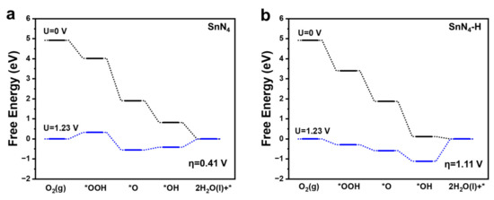 The Gibbs free energy diagrams for the ORR of SnN4 (a) and SnN4-H (b) at U = 0 V (black) and U = 1.23 V (blue) under acid conditions.