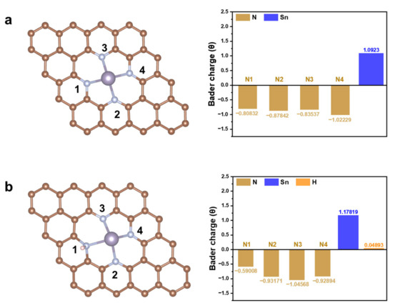 To gain deeper insights into the superior ORR activity of Sn-SACs, we conducted a detailed analysis of the electronic structure of the SnN4 moiety. Specifically, we calculated the partial density of states (PDOS) of the Sn-p and the corresponding p-band center (εp) of SnN4 and SnN4-H to further unveil the origin of SnN4-G catalytic activity. The εp has been extensively utilized to characterize the interaction behavior between the adsorbate and substrate. The results of this analysis were presented in Figure 4. Notably, the decoration of the H atom influenced the εp value of the Sn-N4 structure, and the εp of the SnN4-H moved away from the Fermi level, which in turn affected its catalytic activity. The lower εp may result in stronger adsorption of intermediates such as OH*, which well explain the high strength of *OH adsorption of SnN4-H and its higher overpotential. Next, the Bader charge analysis of SnN4 (Figure 5a) and SnN4-H (Figure 5b) indicated that the Sn active center has a positive charge, which was close to that in the bulk SnO (1.19) [7]. The indication was that the coordinated Sn atom was likely in a +2 charge state. The Sn atom in the SnN4-H catalyst had more positive charge than the counterpart without H decoration, indicating more electrons transformed from Sn to the N-doped carbon framework. Regardless, the surrounding N2–N4 atoms in SnN4-H had more negative charge than their counterparts in the SnN4 catalyst. The N atoms decorated with H atoms (N1) exhibited less negative charge in comparison with N atoms without adsorbed H atoms. Upon adsorption of the H atom, the charge distribution in the system can be altered, leading to the transfer of electron density between the H atom and the surrounding atoms. This redistribution of charges can result in the H atom acquiring a positive charge and the Sn atom in SnN4-H becoming more positively charged.