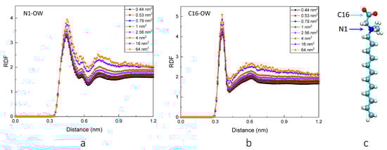The SDFs of water molecules around C16 and N1 atoms. The top seven graphs present those between C16 and water molecules, and the bottom seven graphs present those between N1 and water molecules. The (a–g) symbols represent 0.44 nm2, 0.53 nm2, 0.79 nm2, 1 nm2, 2.56 nm2, 4 nm2, 16 nm2, and 64 nm2 systems, respectively. In order to maintain clarity, only a portion of the tail chain is displayed.