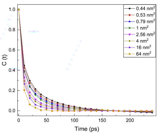 To further study the interactions between water molecules and polar heads, we calculate the time correlation function C(t) of hydrogen bonds for all systems as shown in Figure 3. With the increase in surface area, the relaxation curves decline more rapidly. This indicates that the water molecules around the NDB head group in systems with smaller surface concentrations are freer to move, and the formed hydrogen bonds are weaker. In addition, the larger the surface concentration of NDB systems, the slower their relaxation curves decline. This suggests that the water molecules around the polar heads in systems with larger surface concentrations are more restricted and less likely to escape. To verify these phenomena, the lifetimes of hydrogen bonds are calculated by integrating the C(t), which is fit through the multiple exponential function of [,]. As shown in Table 1, the lifetime of hydrogen bonds decreases from 14.84 to 8.10 ps with the increase in surface area from 0.44 to 64 nm2. This decrease is consistent with the analysis of C(t) curves in different surface coverages. A longer lifetime indicates the stronger hydrogen bond interactions at large surface coverage.